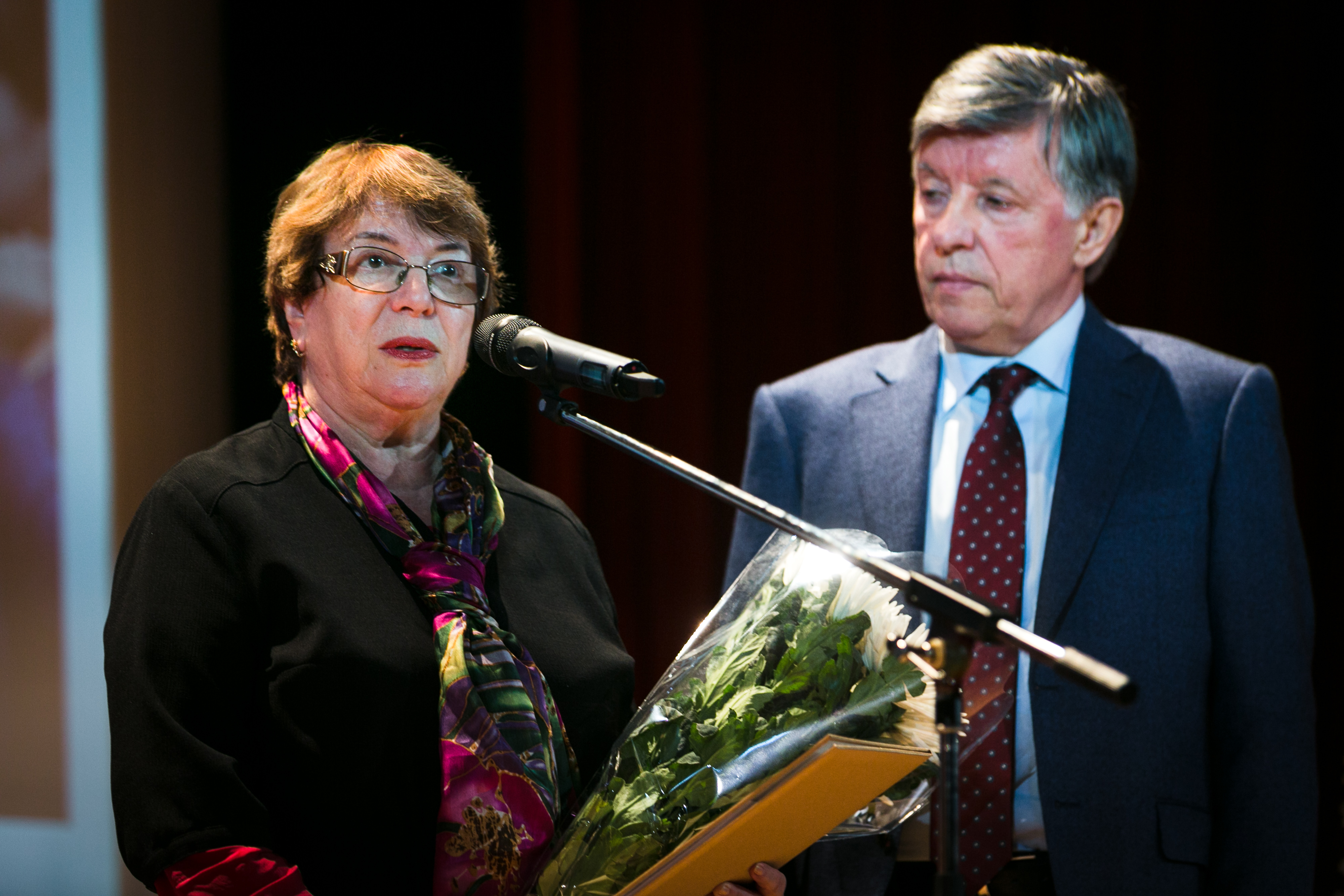 Президент Благотворительного фонда им. П.М. Третьякова Виктор Михайлович Бехтиев вручает Валентине Моисеевне Бялик премию «За верность профессии и многолетнее служение русскому искусству». 2014. Государственная Третьяковская галерея