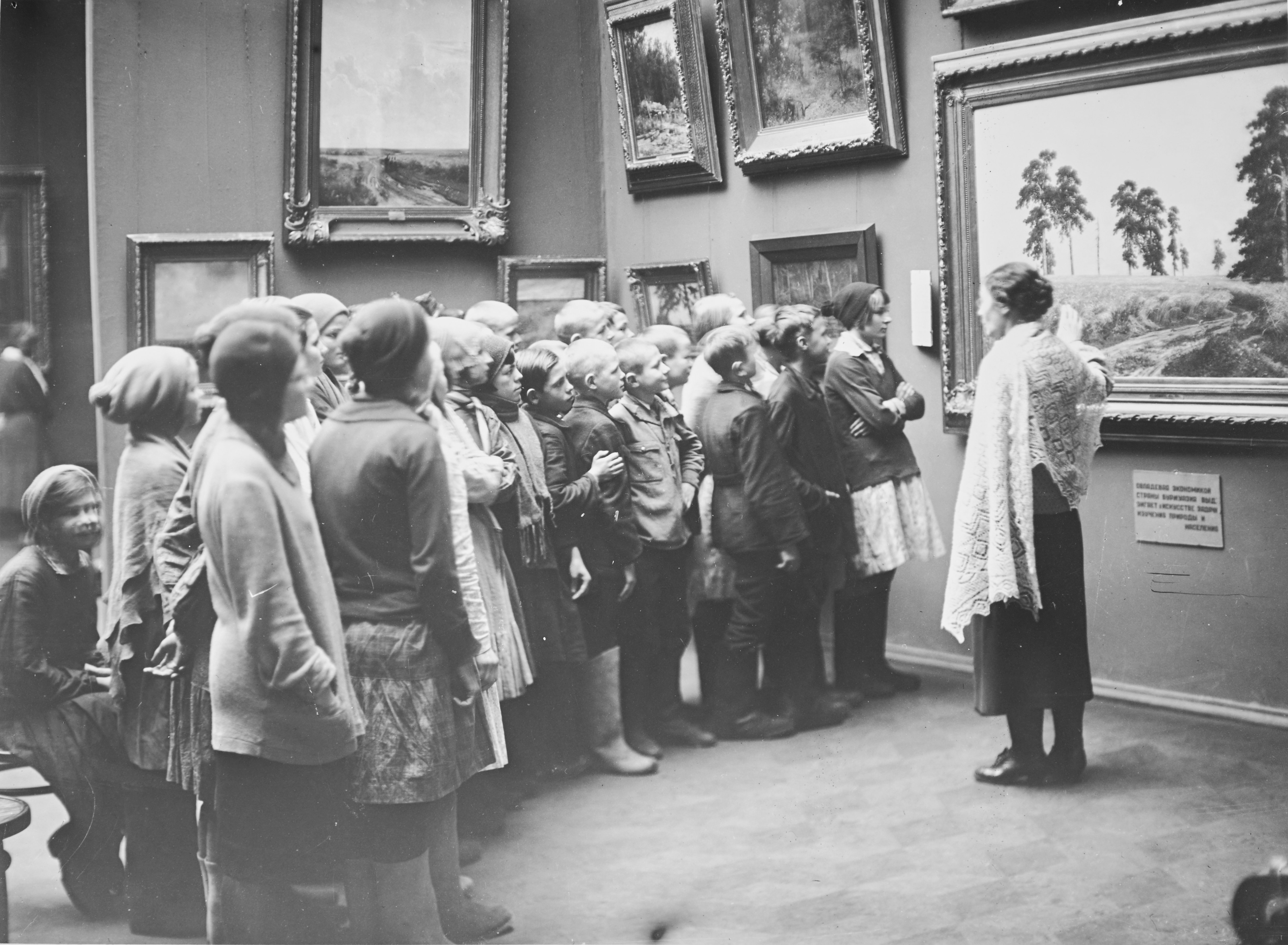 Экскурсовод А.И. Архангельская проводит экскурсию для школьников в залах Третьяковской галереи. 1930-е. Государственная Третьяковская галерея