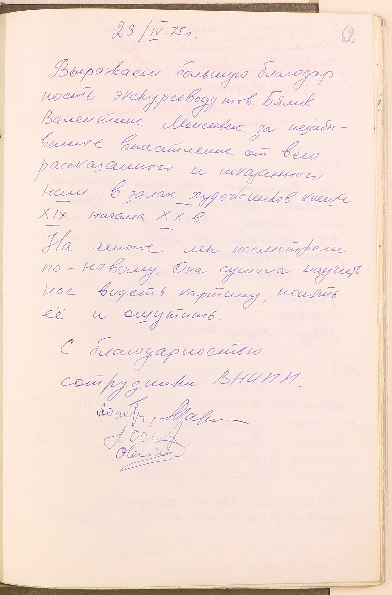Благодарность Валентине Моисеевне Бялик за проведенную экскурсию в книге отзывов Третьяковской галереи. 1975. Государственная Третьяковская галерея