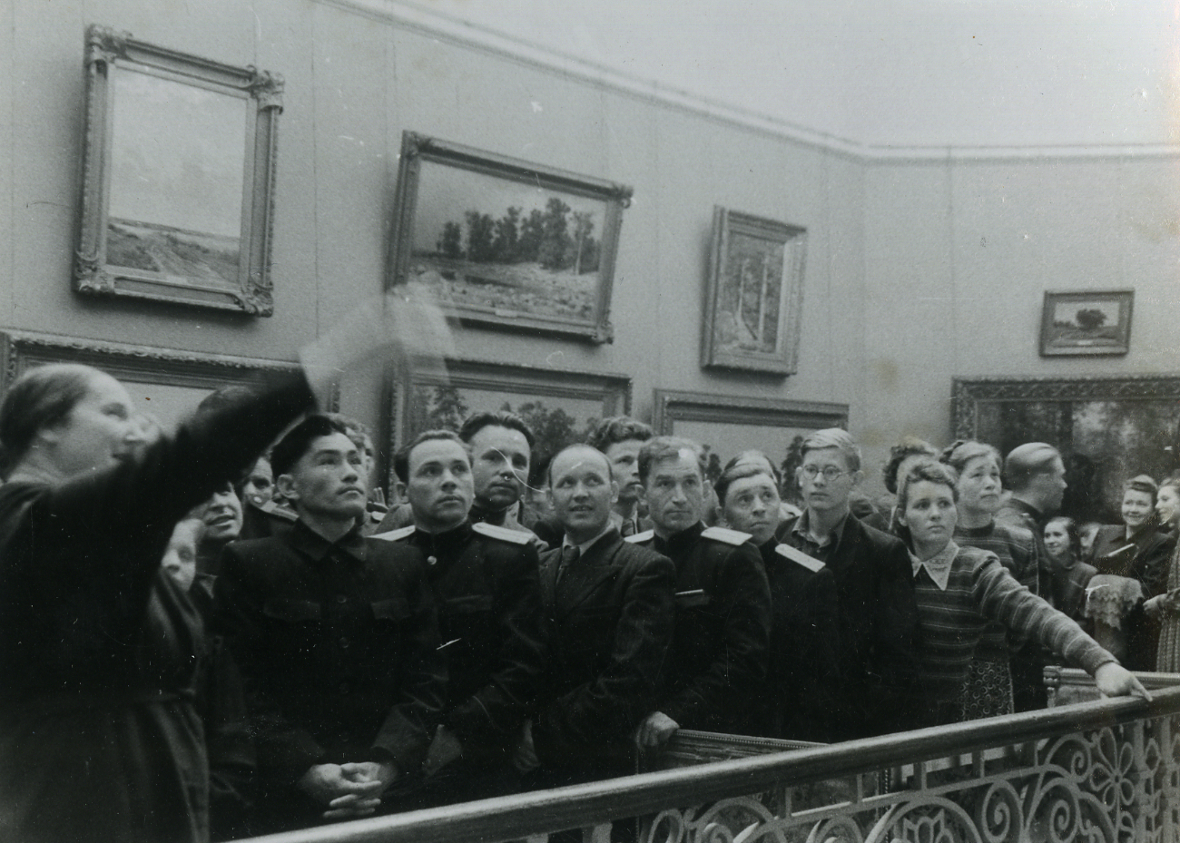 Экскурсовод Л.А. Киселёва проводит экскурсию в залах Третьяковской галереи. Вторая половина 1940-х. Государственная Третьяковская галерея