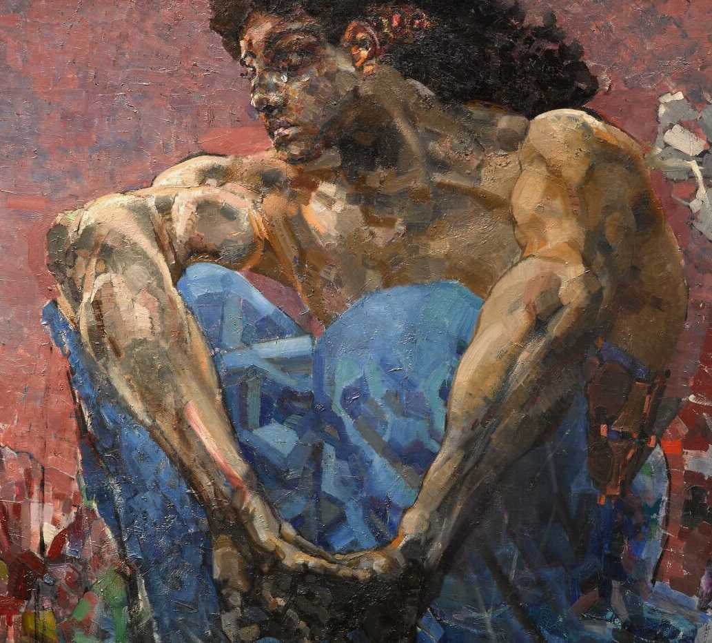 Композиция картины строится на мощном контрасте: горизонтали холста противостоит вертикаль титанической фигуры, словно срезанной верхним краем. В этом решении ощущается влияние Микеланджело — та же титаническая мощь, закованная в телесную оболочку, то же состояние погруженности в себя. Плоть Демона написана Врубелем предельно весомо и материально. Огромное тело, кажущееся высеченным из камня, напряжено и скованно. Руки, сплетенные в замок, напоминают разрываемые цепи. Но самое поразительное — это контраст между массивным торсом и тонким, словно тающим в закатном небе профилем. Кажется, что голова принадлежит иному существу, более утонченному и призрачному.